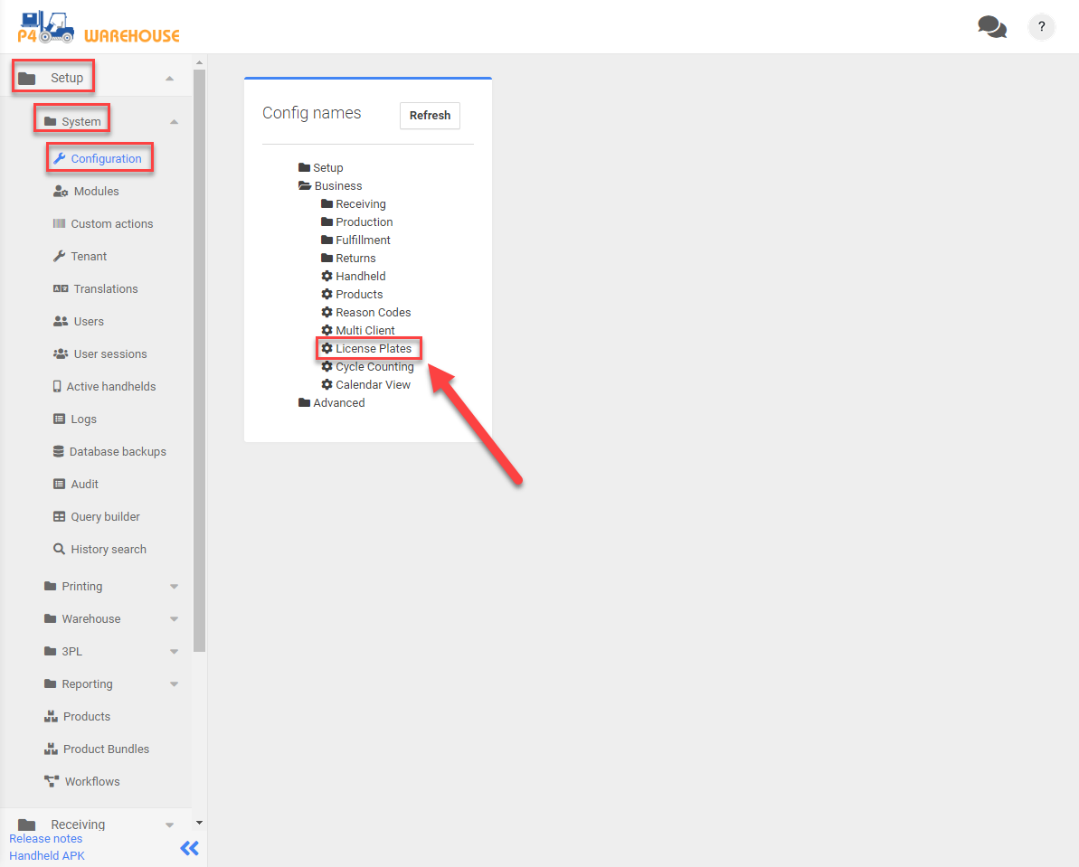To configure pallets (LPNs\_, navigate to Setup > System > Configuration > License Plates.