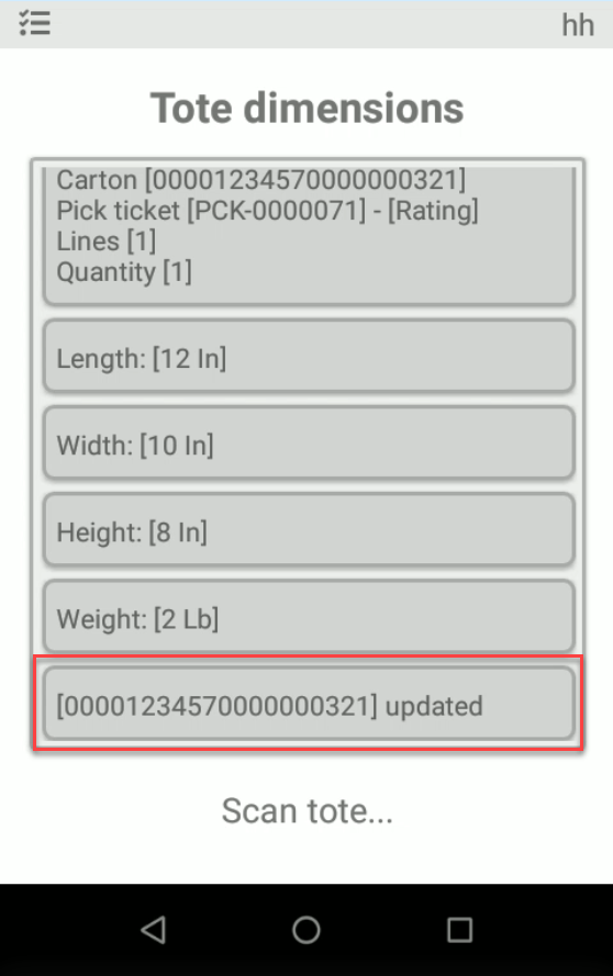 Sequentially enter the Length, Width, Height and Weight of the tote.