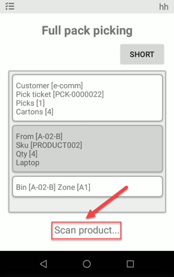 To start a full pack pick, navigate to Fulfillment > Picking > Full Pack Picking using your handheld device.&#x20;