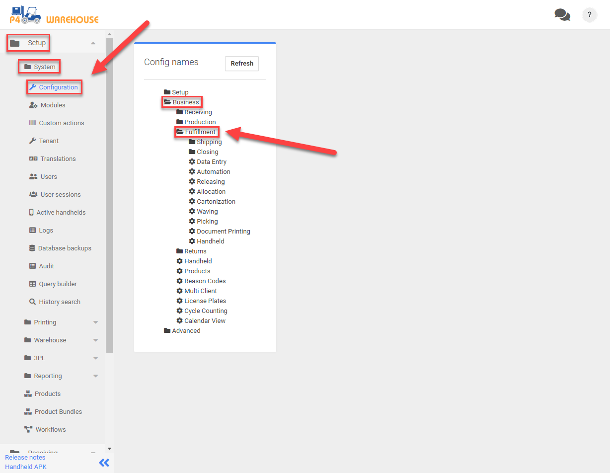 To access system configurations regarding P4W fulfillment segment, navigate to Setup > System > Configuration > Business > Fulfillment folder.&#x20;