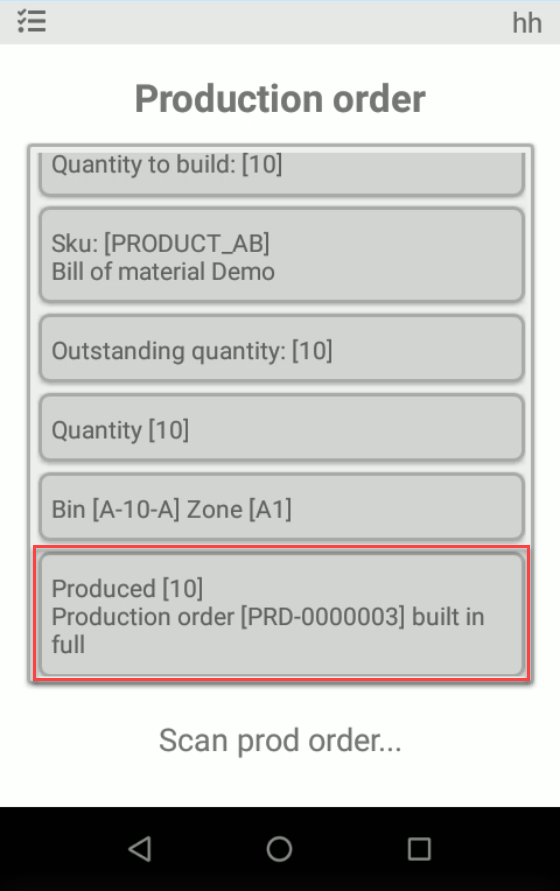 Scan the produced product and enter quantity.