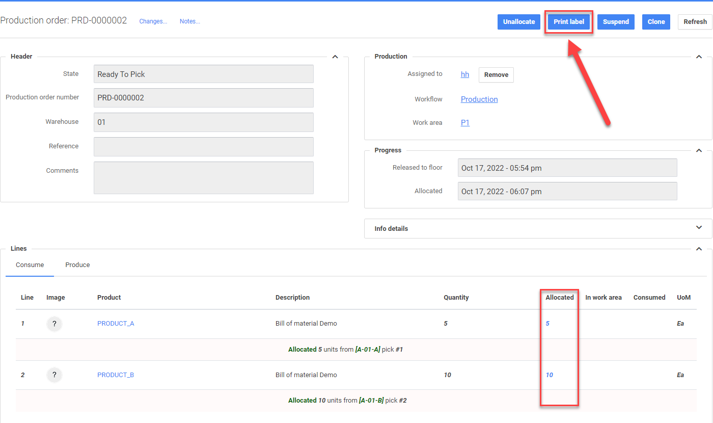 After the order has been released to floor ('Unallocated' state) users can either return it back to draft (if changes to the production order required), suspend it, clone or allocate it for further processing. Use the corresponding buttons to perform these functions.