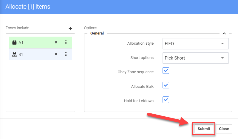 Production order allocation is exactly the same as the pick ticket one. In the pop-up menu set a zone sequence and allocation preferences depending on the product attributes (if applicable)