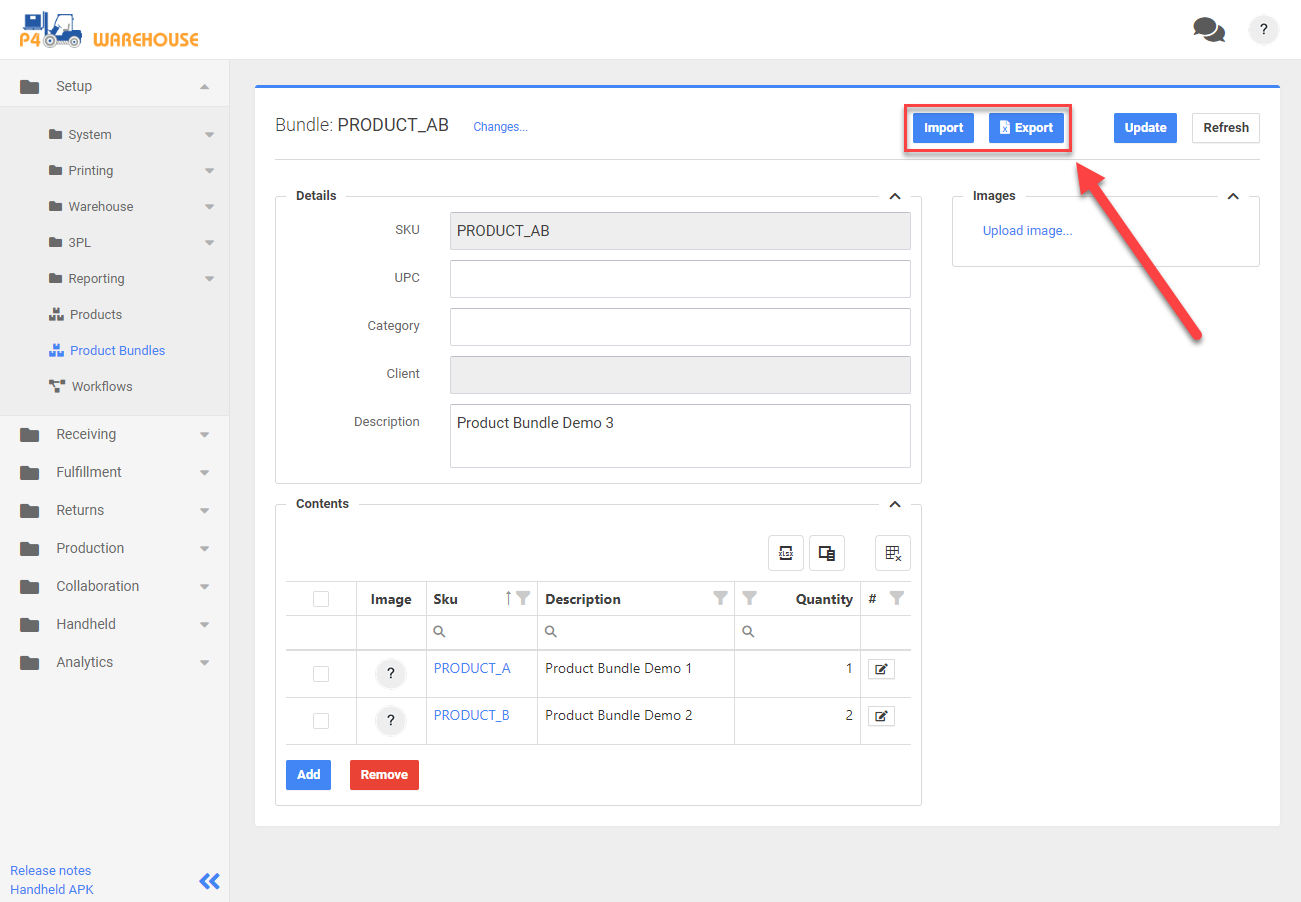 From the Bundle page users can add/edit bundle's information including: UPC, Category, and Description. Both SKU and Client are set during initial bundle creation and cannot be edited later. Click 'Add' button from the 'Contents' section to add product to newly created bundle.